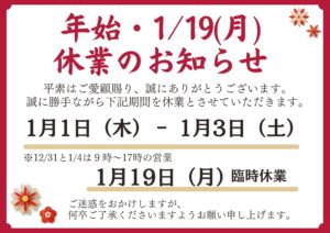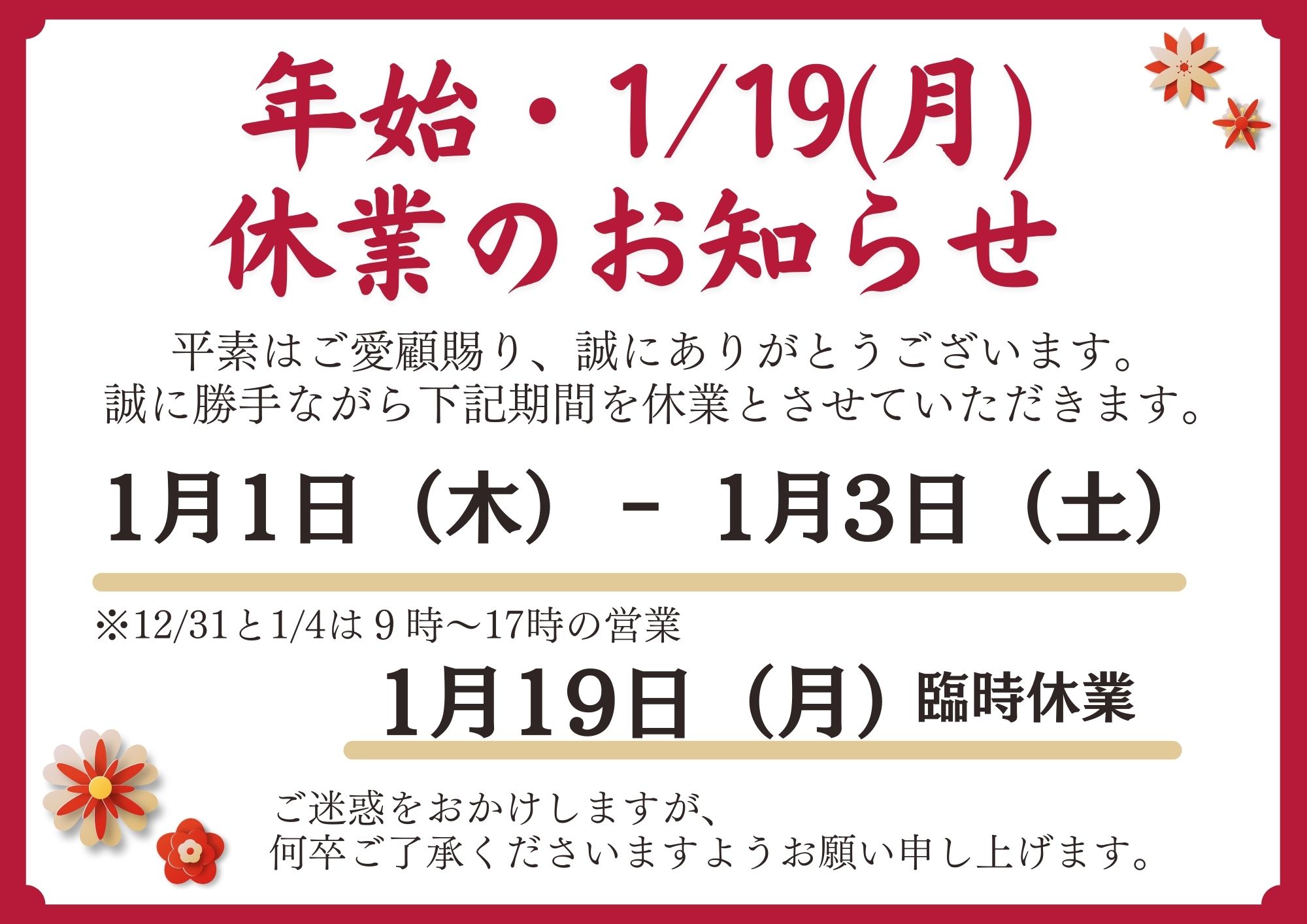 ※令和7年12月31日、令和8年1月4日は時短営業(9:00~17:00) 1月5日から通常営業いたします。