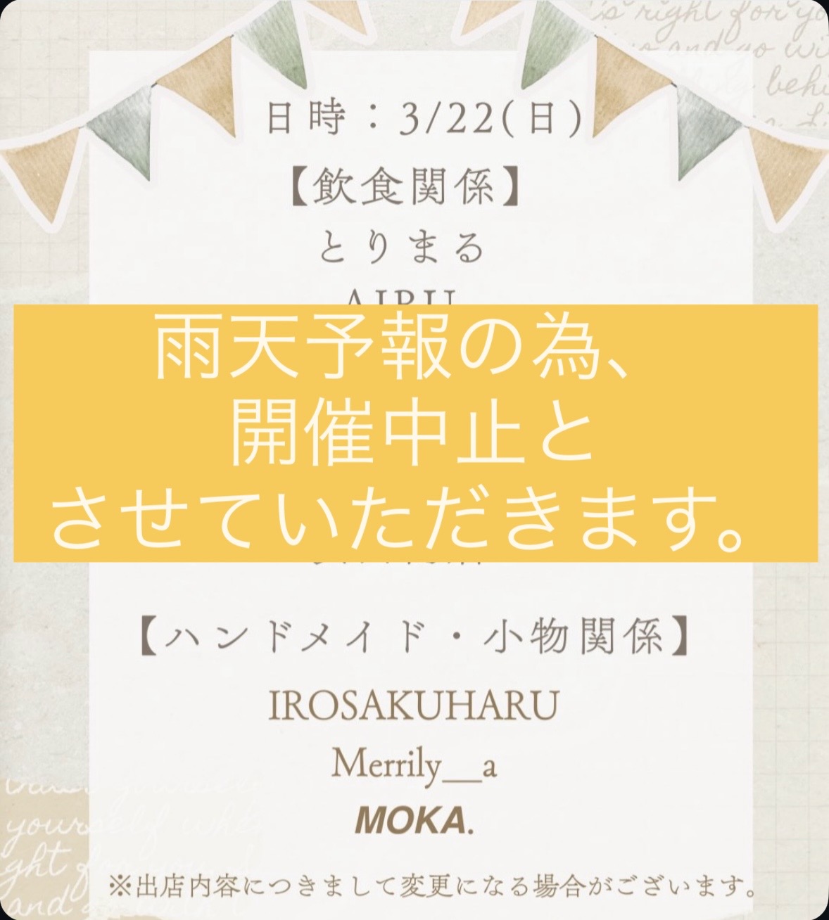 ※3月22日(日)開催分につきましては雨天予報の為、中止とさせていただきます。